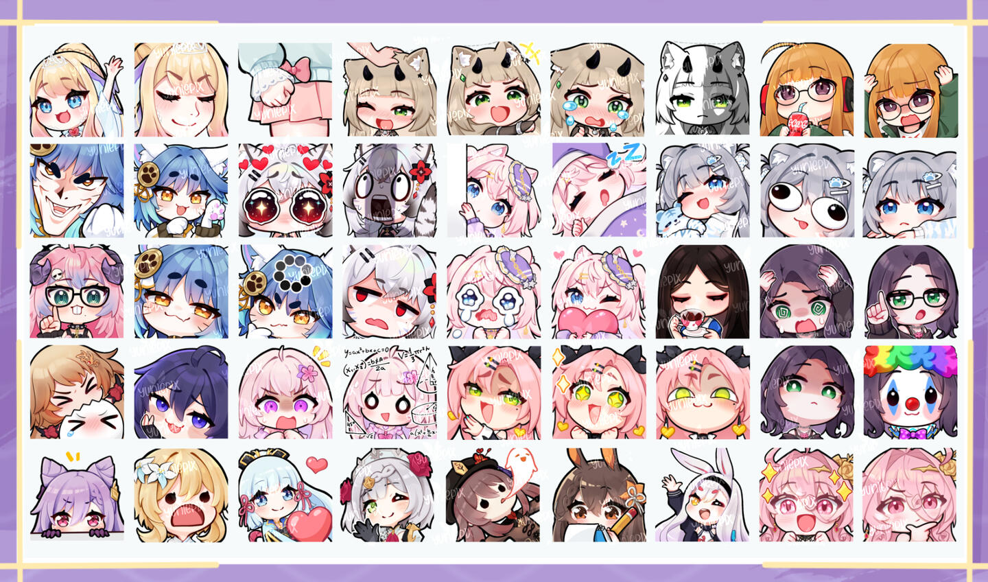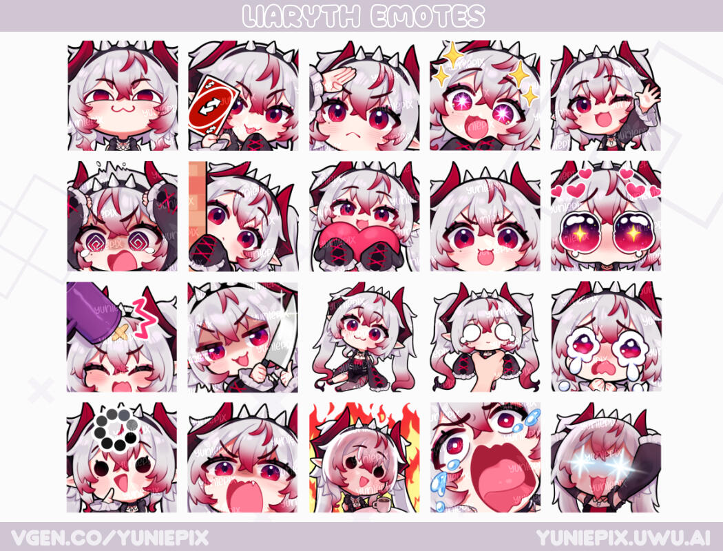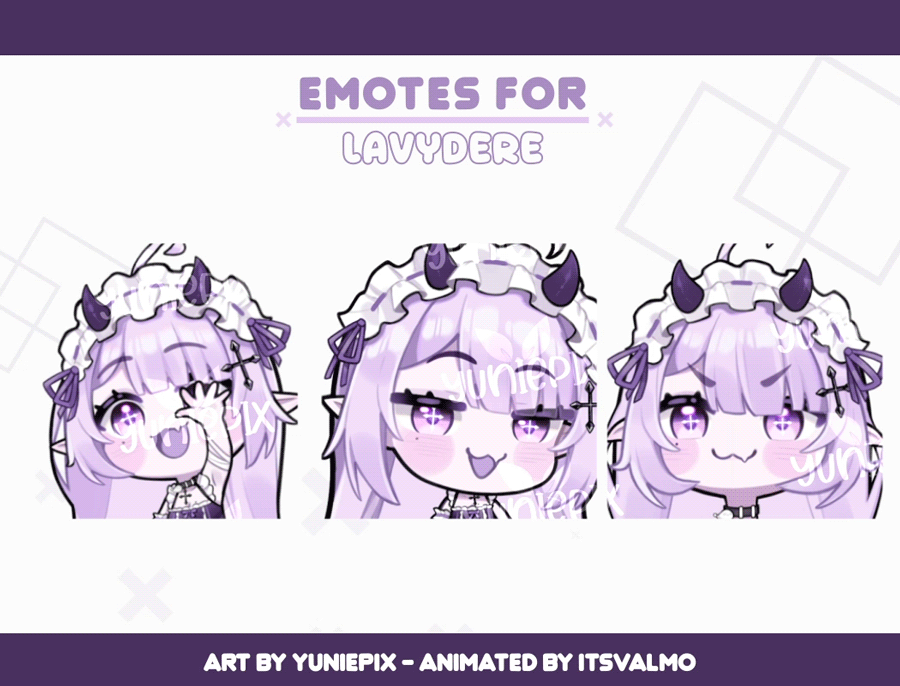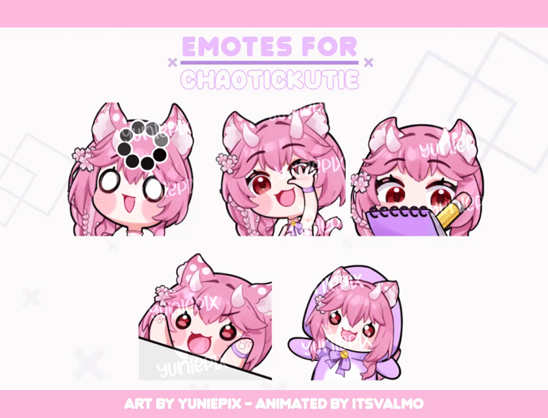 • Credits are required when you use or post my artwork. @YuniePix (artist&rigger) @ItsValmo (emote animator)• You can use the artwork for content creation without extra fees.• Commercial Use / Merchandise: 100% fee applies (to sell prints, keychains, t-shirts... etc)• Reselling my artwork (due to redesign or emergencies) is allowed only at the same price or below the price that you paid for.• I may stream or post commission work on my socials unless client request otherwise +25% privacy fee.• I reserve the rights to turn into YCH any of my emote designs• Usage of my artwork for NFTs or AI is strictly prohibited.